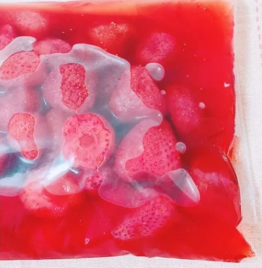 ジップロックにイチゴとウイスキーと砂糖を入れて、2日間寝かせると、次のようになります。