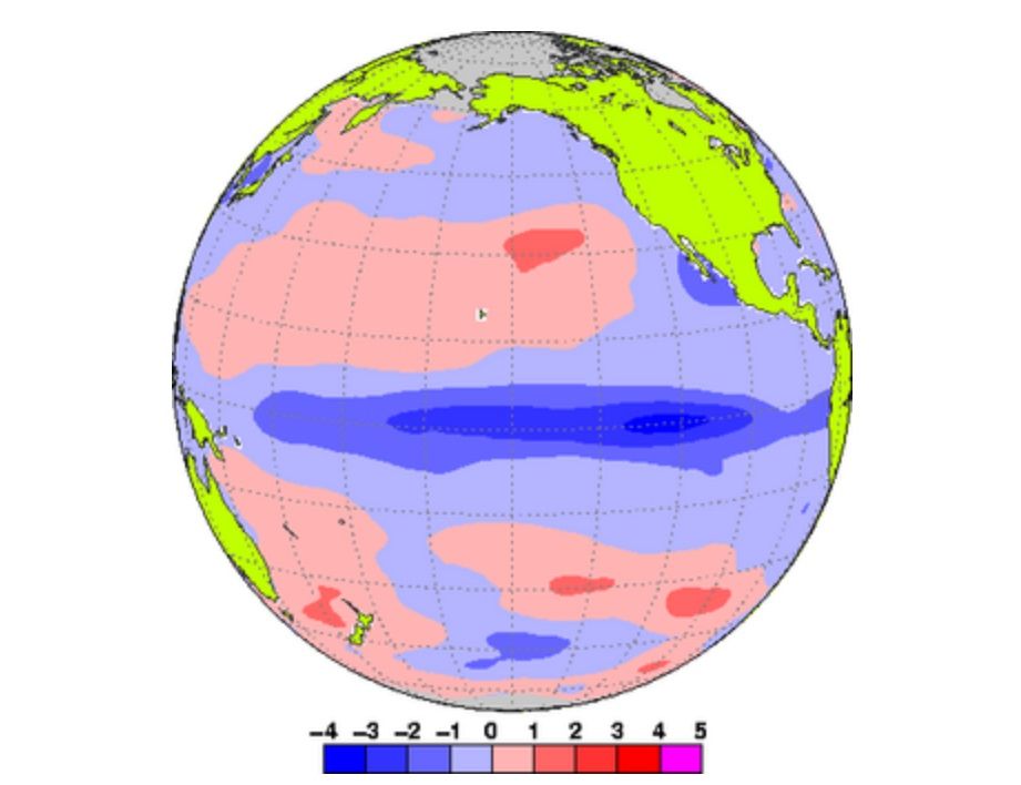 ラニーニャ現象が起きた時の海面温度の変化(地球儀の左に日本があります)