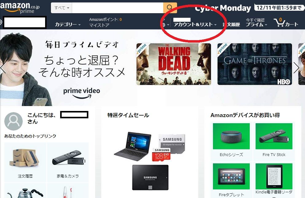 1 画面上部にある「アカウント&リスト」をクリック