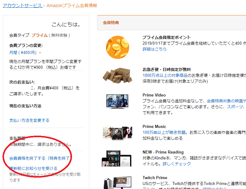 3 Amazonプライム会員情報画面の左「会員資格を終了する(特典を終了)」をクリック